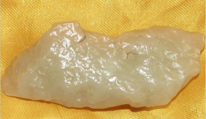 于田料:是一种呈层状分布的纤维交织结构,颗粒也叫小,反映在结构上也较油润,它的层状结构较有规则,所以感觉会较和田料稍透一些,同它层状的结构往往会有特殊的层状断面,层与层之间的断面很易往里面钻。95于田料是于田料中的上品,层与层之间的解理不明显,白度高,细腻油润,不比仔料差的。95于田料不太容易与仔料区分,但也不必区分,因为价格是差不多的。其他的可以根据层状结构来判断。