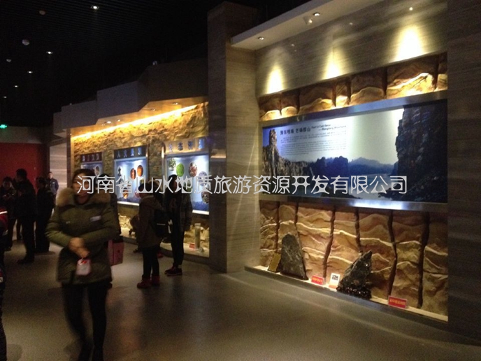 我公司进行设计布展的永城市芒砀山地质博物馆是三层结构建筑,面积3000平方米,分六个厅:分别为序厅、多功能厅、神秘芒砀厅、远古海洋厅、资源环境厅、魅力永城厅。布展资金为1905余万元,2013年7月完成招投标工作,8月1号正式开工,2014年4月完成布展。其设计理念新颖、集科普教育、观赏娱乐、休闲购物、互动体验一体,布展手段多样、有展板、沙盘、5D影院、动态采煤沙盘、岩石标本、矿物标本、古生物化石标本等,充分运用声、光、电,布展效果良好,技术上有领先,艺术效果具有鲜明的地质特色,不管是从视觉效果还是科普方面都达到了国内领先水平。受到市委市政府高度重视,被市委定为永城市“四风”教育基地。